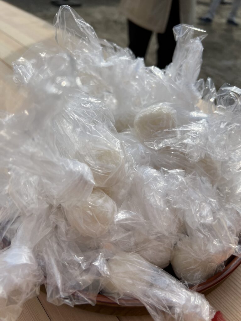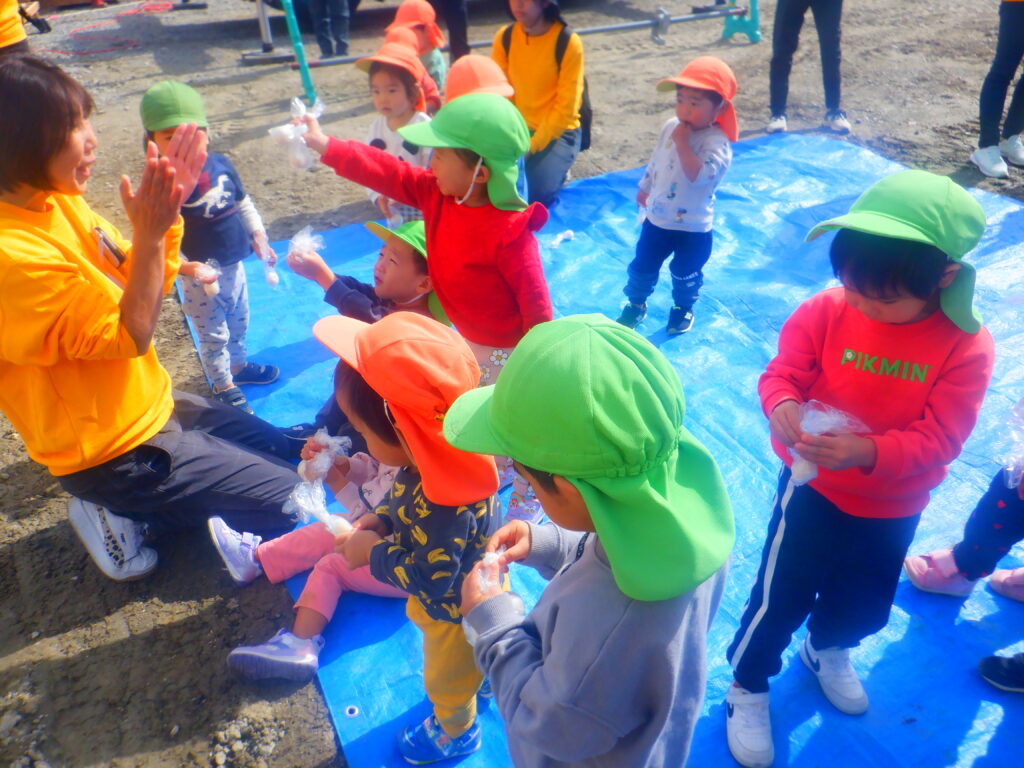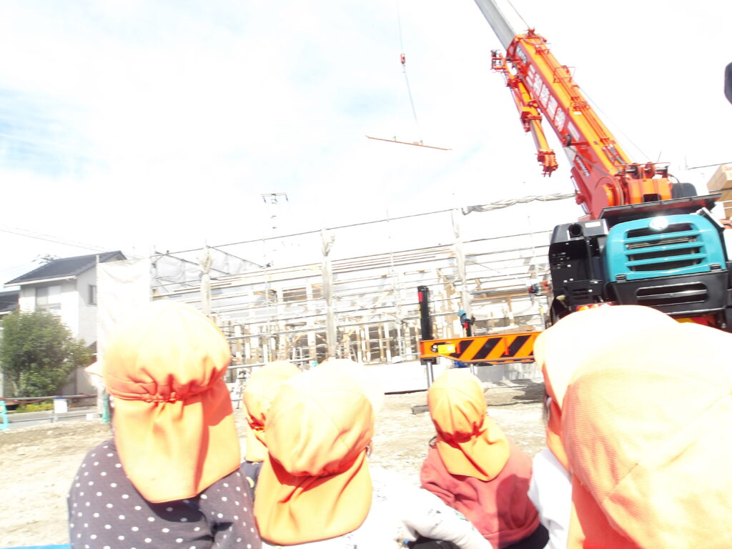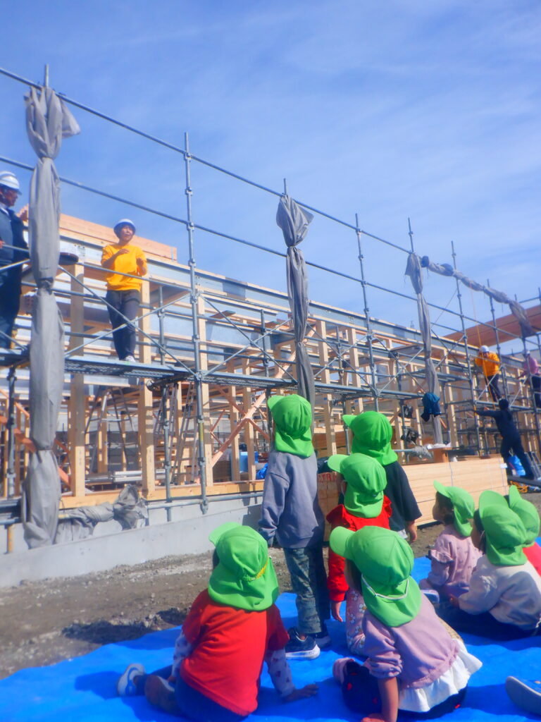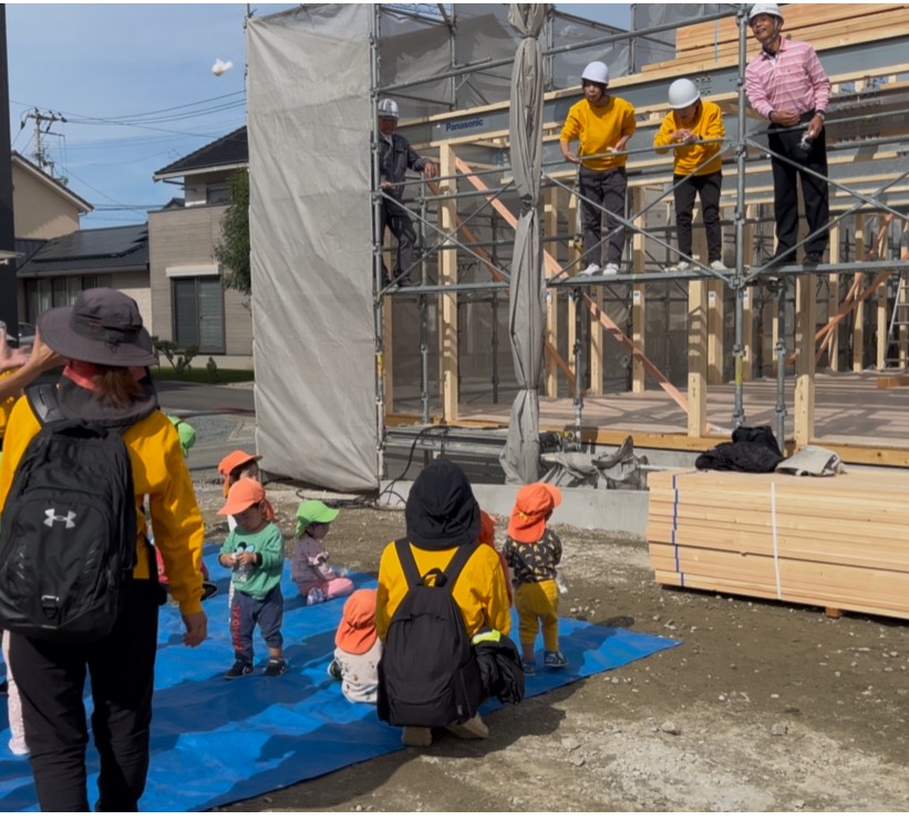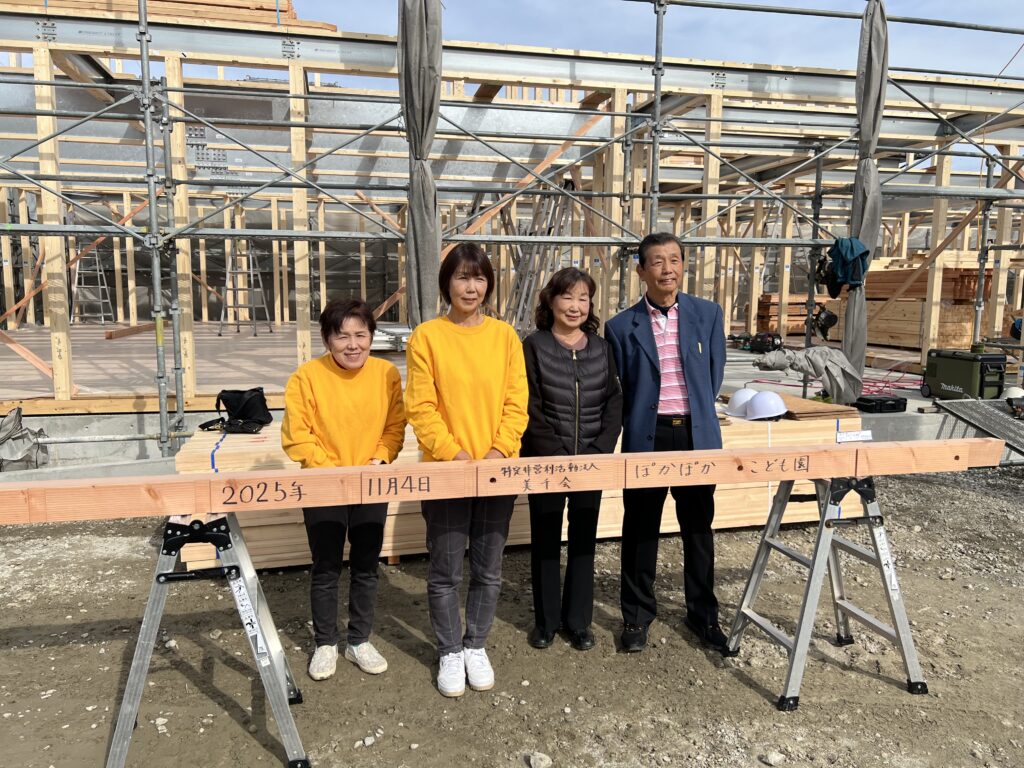 令和8年4月開園予定「ぽかぽかこども園」の上棟式を行いました。 ぽかぽか保育園の職員、子ども全員が上棟式に出席し「餅(だんご)投げ」をしてお祝いしました。