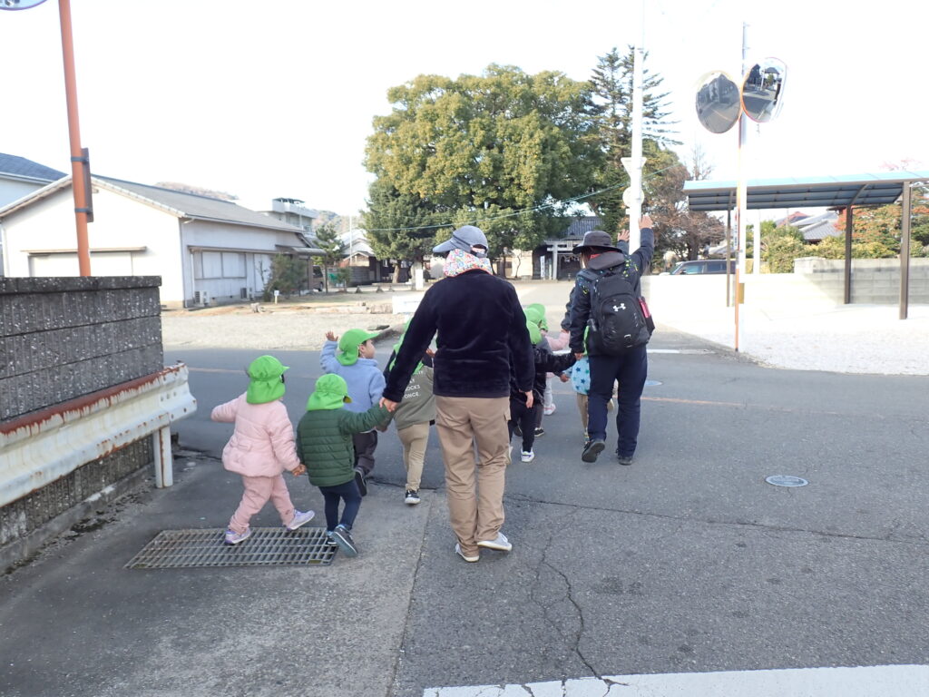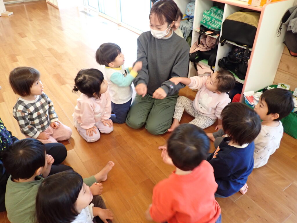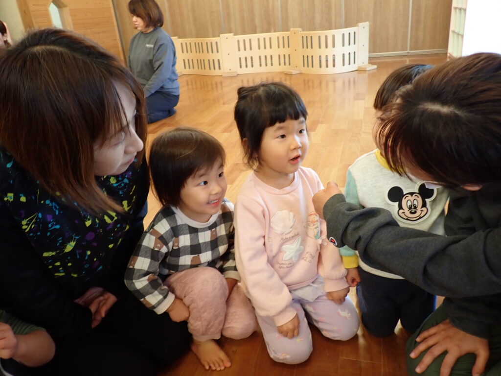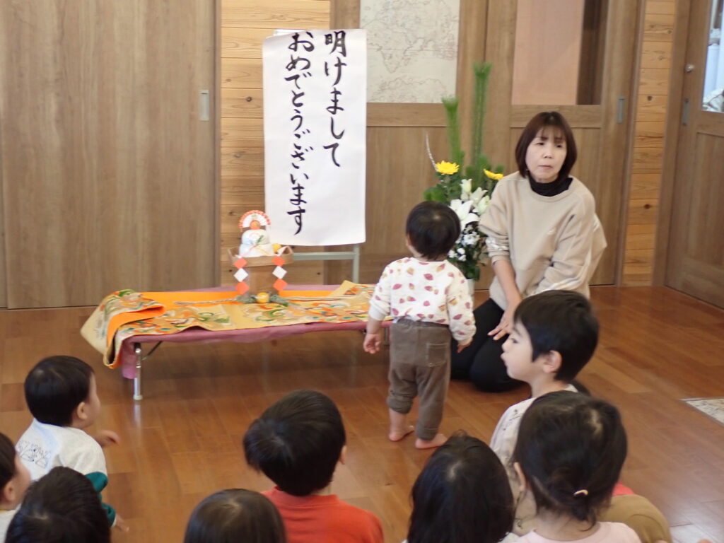 保育者が「年末年始のお休みは、何をしていましたか?」 とインタビューすると、 「お餅を食べて、お参りに行った。」「たこあげをした。」「ご飯食べた。」等、楽しいお正月を迎えた喜びを伝え会いました。